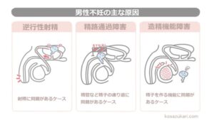 男性不妊の多くは、精子を作る「精巣(睾丸)」の機能低下や、精子の通り道の問題、そして原因不明とされる「造精機能障害」です。