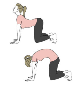 やり方: 四つん這いになり、息を吐きながら背中を丸め、息を吸いながら背中をそらします。