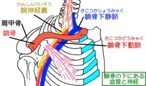 鎖骨のすぐ裏側(下側)には、脳から腕へと伸びる「重要な神経」や「太い血管」が束になって通っています。